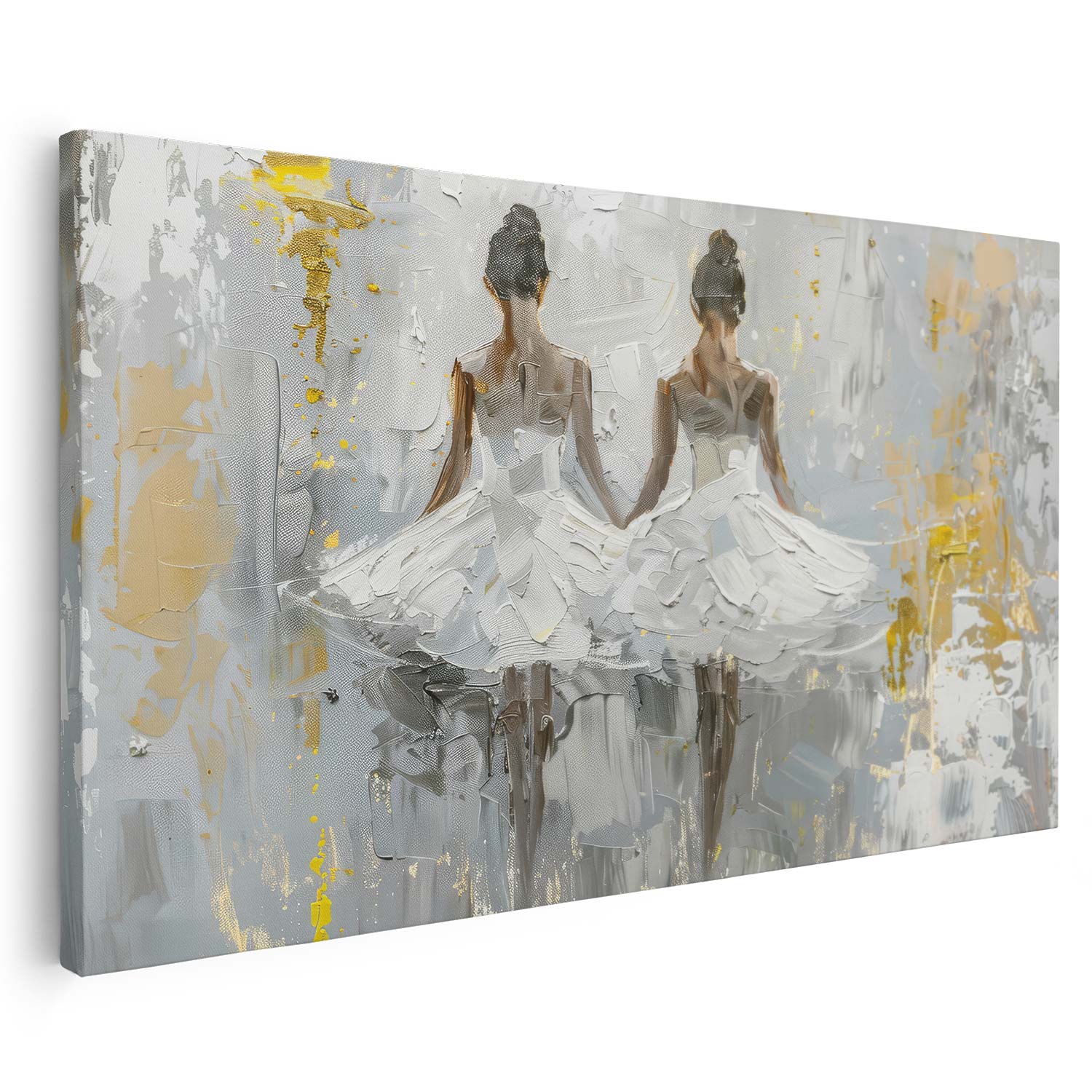 Ce tableau artistique représente deux femmes en pleine danse de ballet, mises en valeur sur un fond minimal et épuré. Leur mouvement gracieux apporte une sensation de légèreté et d’harmonie, idéale pour créer une atmosphère apaisante et élégante dans votre intérieur.
