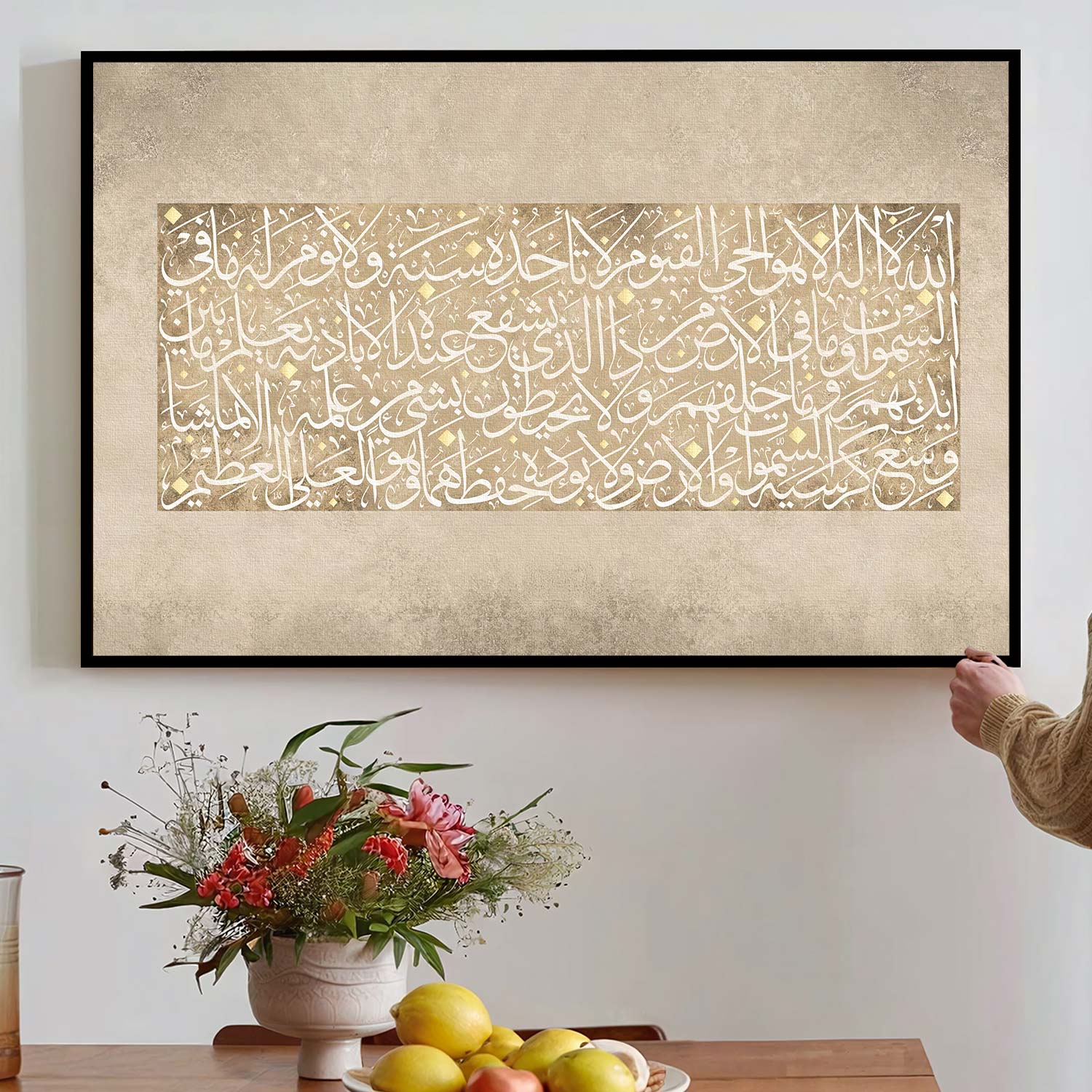 Ce tableau de l’Ayat al-Kursi présente une calligraphie blanche lumineuse sur un fond élégant, symbolisant pureté, sérénité et protection divine. L’écriture claire et raffinée attire le regard et invite à la méditation, créant une atmosphère apaisante et spirituelle. Parfait pour décorer un salon, une chambre ou un espace de prière, ce tableau allie art, spiritualité et élégance, enrichissant votre intérieur tout en rappelant la grandeur d’Allah. Une œuvre idéale pour offrir ou embellir votre décoration avec sens et foi.
