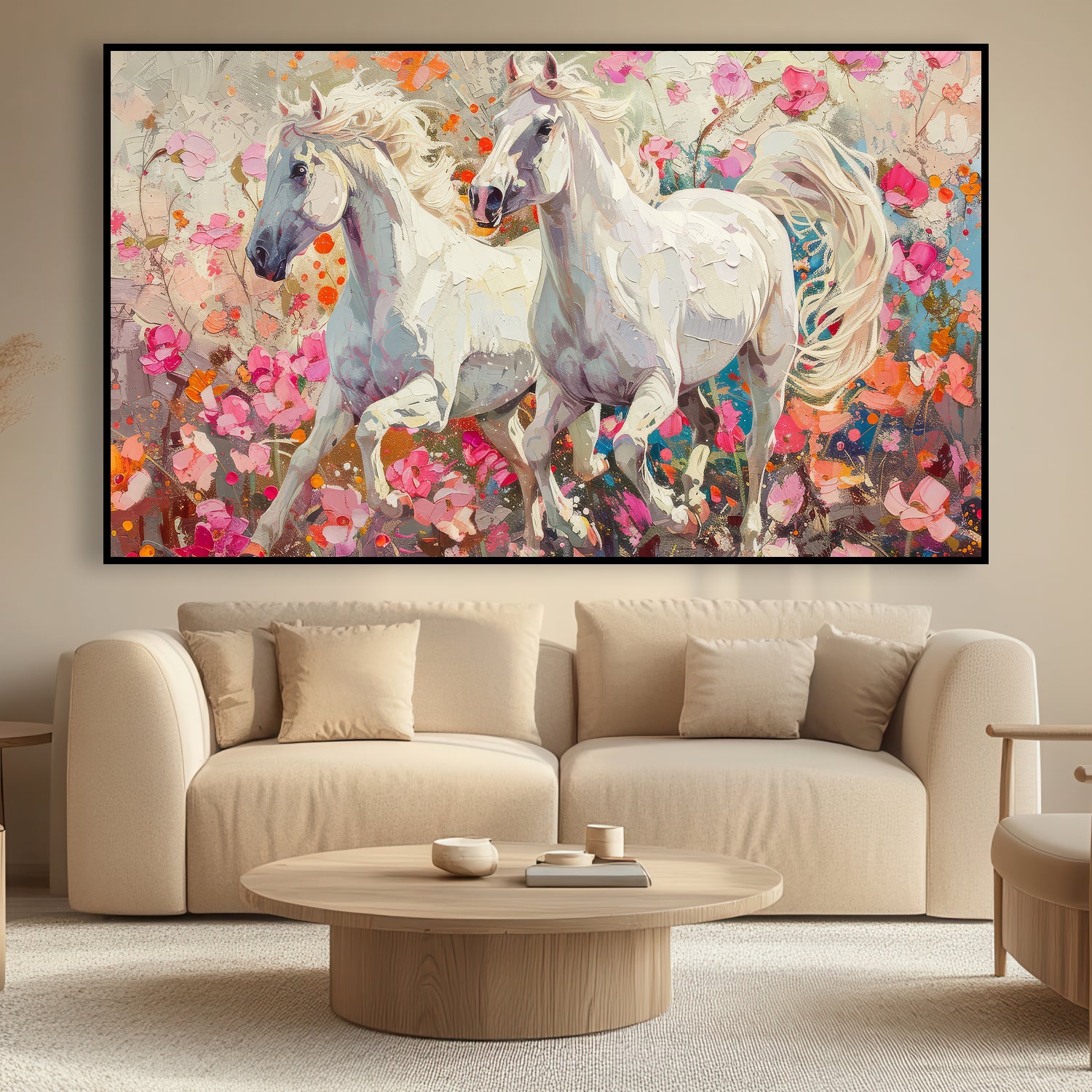 Toile représentant deux chevaux blancs sur un fond de fleurs colorées