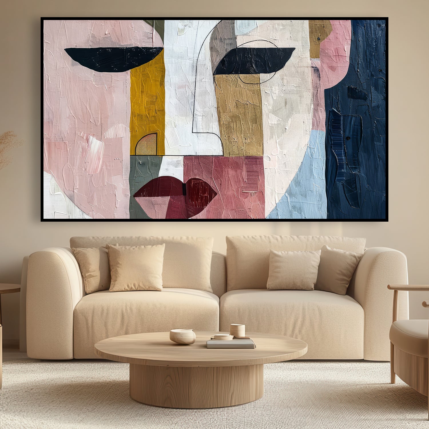 Ce tableau représente un visage stylisé en cubisme moderne, mêlant formes géométriques, couleurs équilibrées et touches artistiques contemporaines. Son design abstrait apporte une dimension créative et expressive à votre décoration intérieure.